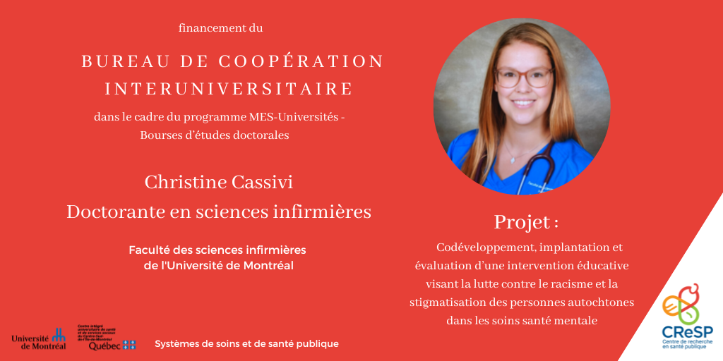 Dans le cadre de mes études doctorales, je m’intéresserai à l’intersectionnalité de la stigmatisation basée sur la race et sur les troubles de santé mentale que peuvent vivre les personnes autochtones recevant des soins en santé mentale. Plus précisément, il sera question de co-développer, implanter et évaluer une formation visant la lutte contre le racisme et la stigmatisation en santé mentale auprès d’étudiants.es au baccalauréat en sciences infirmières à l’Université de Montréal. L’objectif sera ainsi de proposer une formation sécuritaire, appropriée et acceptable permettant de renforcer les capacités des futures infirmières en santé mentale à délivrer des soins équitables et sécuritaires aux personnes autochtones. Christine Cassivi